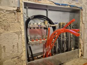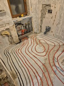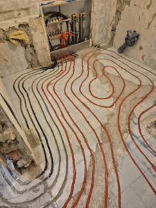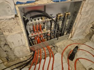 Anschließend verlegen wir die Heizrohre fachgerecht und schließen sie an den bestehenden Heizkreisverteiler an. Auf Wunsch können wir gegen Aufpreis auch einen neuen Heizkreisverteiler liefern und montieren.